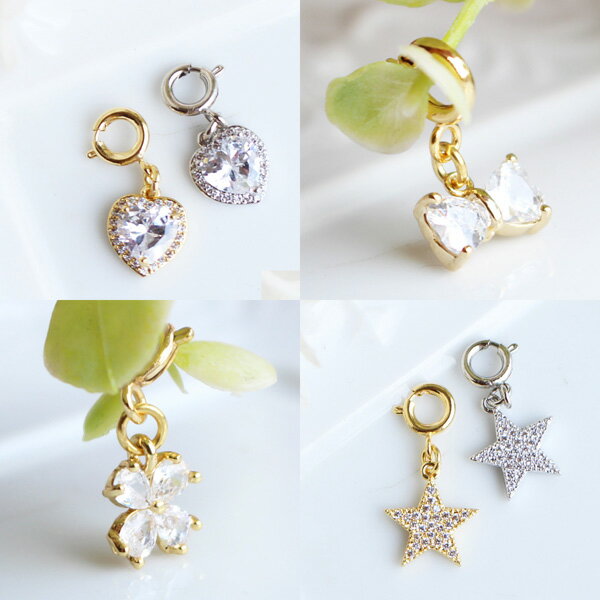 【サイズ】ハート:縦1.2、横0.9cm リボン:縦0.6、横1cm 四葉約:縦1、横0.8cm 星:縦1.2、横1.2cm 【素材】金具:メッキ石:CZジルコニア 【コメント】 6つのチャームを1セットでお届けいたします。